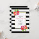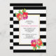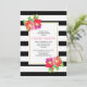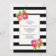 Vacker modern och chic bröllops bröllopsdusch inbjudan som visar vackra vattenfärg tropiska blommor, en kant gjord av svarta och vita ränder och din text på en vit ram. Baksidan är täckt med ett randigt mönster i svart och vitt.