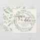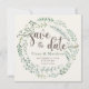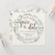Elegant vattenfärg botanisk grönska bladkrans i chokladbrun, skriv kalligrafi, klassisk typografi överlagring mjuk beige. Lösa botaniska blad på andra sidan kortet.