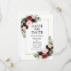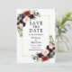 Elegant Watercolor Burgundy Blue Blommigt Spara Tillkännningskortet för Förlovning Bröllop omfattar burguny ro, rosa ros, röd ros, blåa blommor och botaniskt grönt på guld.