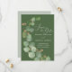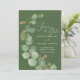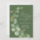 Temapartyets moderna bröllop spara datum-design har vattenfärgen eukalyptus greenery och modern romantisk manustypografi parad med traditionell serif-skrift. Utformningen är inställd på att matcha djup oliv grönt bakgrund och accentueras med vener i elegant guld och hjärtformade löv, och baksidan är en rustik sida/oliv grönt. #SaveTheDate #Eucalyptus #ModernWedding