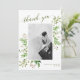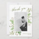 Säg tack till era bröllopsgäster med detta tackkort. Denna design har ditt favoritbröllopsporträtt i en ram av gröna vattenfärgblad och bär på en vit bakgrund, med rubriken "tack" i grönt modern kalligrafiskrift. Anpassa med era namn och bröllopsdatum. Du kan också lägga till ett tryckt meddelande på baksidan eller lämna det tomt för ett handskrivet meddelande.