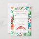 Ett strålande färgat, handmålat, tropiskt svarsbrev med en frodig blom- och ormbunksbakgrund med rosa flamingos som kan dras till valfri plats, göras större eller mindre (+-) eller tas bort.