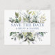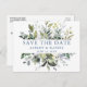 Modern Elegant Vattenfärg Botanisk Grönska Bröllop Engagemang Anmälning Spara Datum Postkort inkluderar eukalyptusblad, grön botanisk lövverk, dammiga blå blad och annan vacker botanisk grönska.