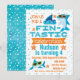 Letar du efter en haj eller fin-tastisk födelsedagsinbjudan? Denna design kan vara vad du söker. Designen inkluderar två hajar, en banner, några sjöstjärnor och diverse bubblor på en vit bakgrund. Baksidan av inbjudan är en vattenfärgstvätt med ett slumpmässigt vitt prickmönster. För fler designs i detta tema, besök butiken. Denna fin-tastiska haj-pojkens födelsedagsinbjudan är redo att anpassas.