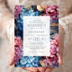 En blommigt för elegant som innehåller lush hydrangeas i skuggor av rosa och blått ger bakgrunden till grått för kol på ett vitt rektangulärt skärm. Blommigtens utformning upprepas på kortets baksida.