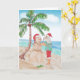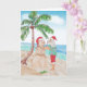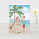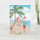 Vattenfärg-målning av tomten med en strandig skjorta full av flamingos som bygger en snöman av sand på stranden. Perfekt för snöfåglar, människor som bor i Florida eller andra kustnära samhällen. God jul rolig strandkort.
