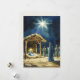 Upplev julens under med denna vackert detaljerade akvarellillustration av julkrubban. Med en strålande stjärna ovanför en enkel stall vilar Jesusbarnet i en krubba, krönt med en mjuk gloria, medan Maria sitter bakom honom och Josef står och vakar över dem. I bakgrunden samlas herdar och vise män för att hylla den nyfödde kungen. Mot en mörk, stjärnklar himmel och förankrad i gyllene halm fångar denna konstverk den fredliga skönheten under årstiden, perfekt för att tillföra en touch av helig elegans till din juldekoration eller som gåva.