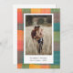 En rustik elegant festlig julkort design med en färgrik vattenfärg karo bakgrund i nyanser av grönt, orange, rött och grått med plats för personligt foto (vertikal eller porträtt orientering).