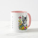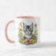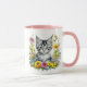Ai-konst som skildrar ett vackert sött grått-kattunge tabby katt omgivet av söt gult och rosa blommor i vattenfärgen stil. Lägg till namn i området för anpassning. I mugg står det Auntie, men man kan ändra det till en namn eller annan familjemedlem.