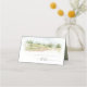I den här samlingen av stationära bröllop används fredliga landskapsbilder av rullande backe och majestätiskt träd för att ange en varm och intim ton för bröllop. Ett handskrivet, namnteckning teckensnitt i kombination med ett modernt sans-serif-tecken ger en elegant tryckning. På det platskort i bord som visas här finns rullning av backe och träd i skuggor från gyllene gult till grönt med en bakgrund av drömmande vattenfärgsfärg på stänk. Du kan också visa ditt monogram, namn och bröllop på motsatt sida med en enkel vattenfärgbakgrund i en grönt för insida. Sök i ID786 om du vill se andra delara och färg-alternativ för den här uppsättningen.