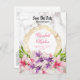 Ett vykort i klassens bröllop spara datum med modern utformning - en faux marble struktur i vitt utgör bakgrunden. Överst är ett runt ram med ett guld dekorativt gräns. Storfärgade rosa- och lila vattenfärgstygnblommor med grönt bläckstråleaccenter dekorerar designen. Anpassa med dina uppgifter om bröllop på fram- och baksidan.