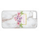 Ett telefonfodral med modern design - en faux marble struktur i vitt utgör bakgrunden. Överst är en ram med faux guld-folie gräns. Storfärgade rosa- och lila vattenfärgstygnblommor med grönt bläckstråleaccenter dekorerar designen. Anpassa med namn.