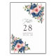 Trendiga rosenskära och marinblå blomsterbröllopsbord nummerkort som kan anpassas till ditt evenemang.