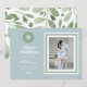 Fira högtidsperioden med dessa eleganta, blå och vattenfärg gröna accenter. Denna design har ett anpassat monogram i en grön, vattenfärgs krans med möjlighet att lägga till ditt eget personliga meddelande och foto.