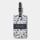 En resemärketag med ett vackert mönster. Tallkottar, fjädrar, tallbarr och bärkvistar. Rustik vattenfärgsdesign.