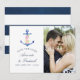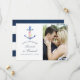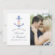 Trendigets marinerade och vita nautiskt tema bröllop spara datum-fotokort med vattenfärgsankare för blommigt och marin rand på motsatt sida.
