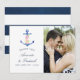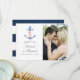 Trendigets marinerade och vita nautiskt tema bröllop tackar dig för att du har ett fotokort med vattenfärgsankarpunkt och marinankarpunkt rand på motsatt sida.