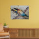En underbar vattenfärg av en färglös biodlingsfågel i blått, gult och svart på grenarna av ett ljusbrunt träd. Från min samling djurmålningar.