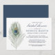 Vackra bröllopsdusch-inbjudningar har en enda påfågel fjäder i mjuka vattenfärger, med dina evenemangsuppgifter i en blandning av block- och script-typografi. Ett elegant val för moderna brudar, denna design är formell och förfinad utan att vara stel och innehåller klassisk typografi och ett trendigt vattenfärg-element. Baksidan av kortet är i samordnande enfärgat blått.