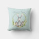 En bedårande dekorativ kudde för vår och påsk, denna akvarellillustration har en söt kanin sittande i en blomsterkrans av vårens narcissoser, videkatt, spirande iris och löviga kvistar och grönska. Den lekfulla texten "hoppsan påsk" ovanför kaninen kan redigeras med annan text om du föredrar det. Bakgrunden är en pastellblå färg i nyrobinsäggsfärg för att föra ut vårtemat. Baksidan av kudden är enfärgat pastellblå i nyrobinsäggsfärg.