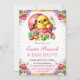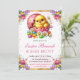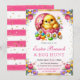 Elegant vattenfärg påskkyckling i chokladägg design med rosa, lila och gula vårblommor design med rosa randig bakgrund
