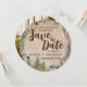 Det tvåsidiga runda kortet är perfekten Spara datumkortet för alla roliga teman bröllop. Den här vackra utformningen är både romantisk och rustik och fungerar för rustika-, skogs- eller bergsevenemang. Utformningen har ett rundat skivsegment av träkorn, vilda blommor och träd.