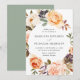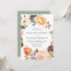 Elegantens bröllopsinbjudningar under hösten som visar dina uppgifter om bröllop som omges av vattenfärgblommor, självkullar och löv i nyanser av rosa, persikor, orange, grädde, brun och grönt. Bröllopsinbjudningarna för höstens blommigt återgår till en solid grönt-bakgrund.