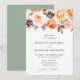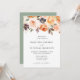 Elegantens bröllopsinbjudningar under hösten som visar gräns i vattenfärgsblommor, blomsterprodukter och löv i nyanser av rosa, persikor, orange, kräm, brun och grönt. Bröllopsinbjudningarna för höstens blommigt återgår till en solid grönt-bakgrund.
