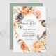 Elegantens bröllopsinbjudningar under hösten som visar dina uppgifter om bröllop som är inramade av vattenfärgblommor, självkullar och löv i nyanser av rosa, persikor, orange, vit, brun och grönt. Bröllopsinbjudningarna för höstens blommigt återgår till en solid grönt-bakgrund.