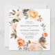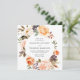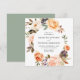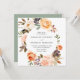 Eleganta höstblommiga bröllopsinbjudningar som visar din bröllopsinformation omgiven av vattenfärg blommor, suckulenter och blad i nyanser av rosafärgad, persika, orange, kräm, brun och grön. Baksidan på höstblommiga bröllopsinbjudningar har en enfärgad grön bakgrund.