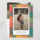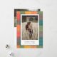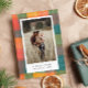 En rustik elegant festlig julkortdesign med en färgrik vattenfärg rutmönster bakgrund i nyanser av grönt, orange, rött och grått med plats för personligt foto (vertikal eller porträtt orientering).