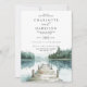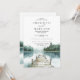 Rustik vattenfärg skog berg sjöbryllopsinbjudan, med en lugn bergssjö och omgivande tallskog, med en brygga som leder ut till vattnet. Klassisk typografi och mjuka blå och gröna nyanser. För ett perfekt naturbröllop på destinationen. Tillgänglig i tryck, som digital nedladdning eller båda.