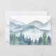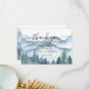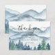Elegant rustik vattenfärg berg och skog scen bröllop tack kort, med frodiga blå och gröna träd och berg med en script text: låt äventyret börja. För dem som älskar en romantisk drömsk skogstema för deras ceremoni och firande.