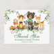 Vattenfärg Skogs Djur Baby Dusch Tack Postkort. Baby Djur inkluderar Björn med Grön Båge, Hjort, Älg, Tvättbjörn, Kanin, Räv och Uggla på eukalyptusblad och skogsgrönska. Grön Script.