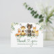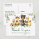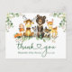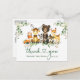 Modern kalligrafi Hjärt, Vattenfärg Skogsdjur Baby Dusch Tack Kort. Bebisdjur inkluderar Björn, Hjort, Älg, Tvättbjörn, Kanin, Räv och Uggla på eukalyptusblad och skogsgrönska.