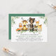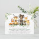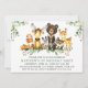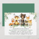 Vattenfärg Skogsdjur Första Födelsedagen Inbjudan. Bebisdjur inkluderar Björn, Hjort, Älg, Tvättbjörn, Kanin, Räv och Uggla på eukalyptusblad och skogsgrönska.