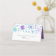 Perfekt design för ditt vinterbröllop! Platskortet har en rad där du kan skriva gästens namn och deras bordnummer. Det finns vattenfärg snöflingor ovanför raderna. På baksidan kan du ha parets namn och bröllopsdatum. Insidan av kortet är rosa och blå ombre.