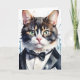 Vattenfärg stänk konst av en tabby katt i smoking och svart fläsbåge på detta tomma vykort.