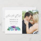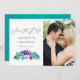 Färgglada vattenfärg tropiska blad och orkidéer spara datum-kort med turkos blå vattenfärg tvätt baksida.