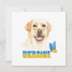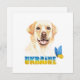 Ett sött sätt för hundälskarna att visa sitt stöd för Ukraina. Fyrkantiga platta gratulationskort har vattenfärgsillustration av hund Labrador Retriever med texten "Ukraina" och fjäril i färgen blue and gult på deras nationella flagga.