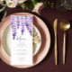 Den här menykortsdesignen har vattenfärgsblommor i mjuk lavender och lila med grönt löv på vit bakgrund med personlig-menyn nedan. Texten kan vara personlig genom att textrutorna redigeras. Du kan ändra färg på menyns baksida i redigeraren. Designad för dig av Evco Studio © på www.zazzle.com/store/evcostudio #bröllop #menucard #wisteria #vattencolor #weddinginspiration #botanical #foliage #blommigt #blommor #elegant #snyggt #modern #design #populär #topsellers #topsäd #anpassningsbar #trending #winterbröllop #källbröllop #autumnbröllop #blommed #förlovning #stationär #personlig #personlig #destination #formal #Classic #firande #white #lavender #lilac #violet #lila #grönt #party # #funktion # #partyplan