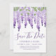 Watercolor Wisteria Save the Date (spara datum) innehåller vattenfärgsblommor i mjuk lavender och lila med grönt löv på vit bakgrund med Spara datuminformationen nedan. Anpassa genom att redigera texten i textrutorna. Designad för dig av Evco Studio www.zazzle.com/store/evcostudio
