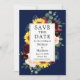 Modern Elegant Watercolor Blommigt Save Datakortet omfattar burgundisk ro, rosa ros, blåa blommor, rödblommor, solblommor, eukalyptus löv och botaniskt grönt löv på guld ram. Blått bakåt.
