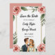 Den här blommigten med elegant vattenfärg sparar datumet inbjudan är perfekt för ett modernt bröllop. Den romantiska designen har en elegant vattenfärgsbild i ram med en blommigt med brud- och groombild och svart kalligrafi på vit bakgrund.