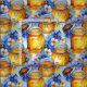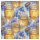 Denna väv har en mönster av vattenfärgen burk av honung med honungsomrörare och blåa blommor.
