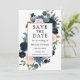 Modern Elegant Watercolor Dusty Blue och Rosa Blommigt Ram Bröllop spara datum Förlovning annonscertifikat omfattar rosa ros, blått ro, blåa blommor, löv, eukalyptus och botaniskt grönenergi. Rosa Tillbaka.