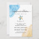 Nautical Boutique Co. s inbjudan till kustnära förlovning innehåller färgrutor av vattendjö och färg i havsblått och strandtoner och accentueras med motsvarande vattenfärgsstjärnfisk. "Förlovning Firande" är i elegant skripttypografi och är parad med modern blocktypografi. Baksidan har samma utformning som inslag. #CoastalWedding #DestinationWedding #Engaged