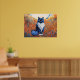 Förbluffande vattenfärgsmålning av en svart katt som står i en fält av röda vallmo. Kontrasten mellan mörk päls och ljusa blommor skapar en slående effekt.