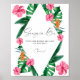 Tropical Handflatan Watercolor Inbjudningskort för möhippan. Konstruktionen har en vattenfärgad elegant buquet av klassisk strandvattenfärg, grönenergi och blommor, inklusive rosa hibiscus, orange och blåa fåglar av paradiset, grönt grey och mörk grönt handflatan löv.