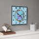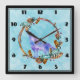En klocka med en grafik som består av en varg med lila vattenfärg, i ett klassiskt hovlande läge. Omgiven av teckning av en krans av trä, kristaller, fjädrar och pärlor. Coola boho stil.